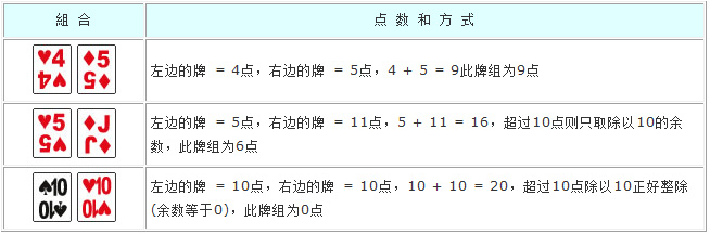 - 以两支牌点数之和的个位数来分胜负,最大是9,最小是0